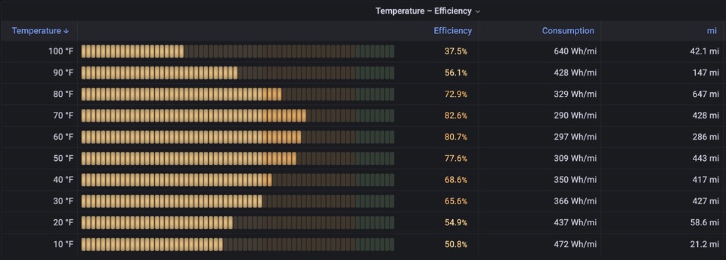 Como podéis observar en 100ºF (38ºC) la eficiencia se desploma, siendo la temperatura óptima los 21ºC. También hay que tener en cuenta que a partir de cierta temperatura se usa también el Aire Acondicionado que consume bastante energía con lo que no todo es imputable al consumo del motor pero hay que tener en cuenta todo.