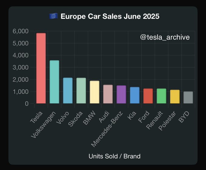 Las primeras cifras de ventas de coches eléctricos en Europa durante junio de 2025 confirman el pulso comercial que mantiene Tesla con los fabricantes tradicionales del Viejo Continente. Según los datos recopilados hasta el 13 de junio, la marca americana lidera el ranking con 5.842 unidades, muy por delante de Volkswagen, que se queda en 3.588 coches eléctricos entregados.