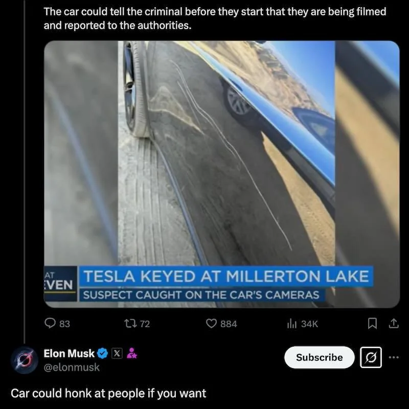 Un usuario de X (que para mi será siempre Twitter) lanzó una sugerencia a los ingenieros de Tesla: “¿Sería posible que el coche detectara cuando alguien intenta arañarlo y diera un aviso de que está siendo grabado y reportado a las autoridades?”. La respuesta de Elon Musk fue directa y sencilla: en lugar de un sistema de advertencia verbal, los Teslas podrían simplemente hacer sonar el claxon cuando detectaran un intento de vandalismo.