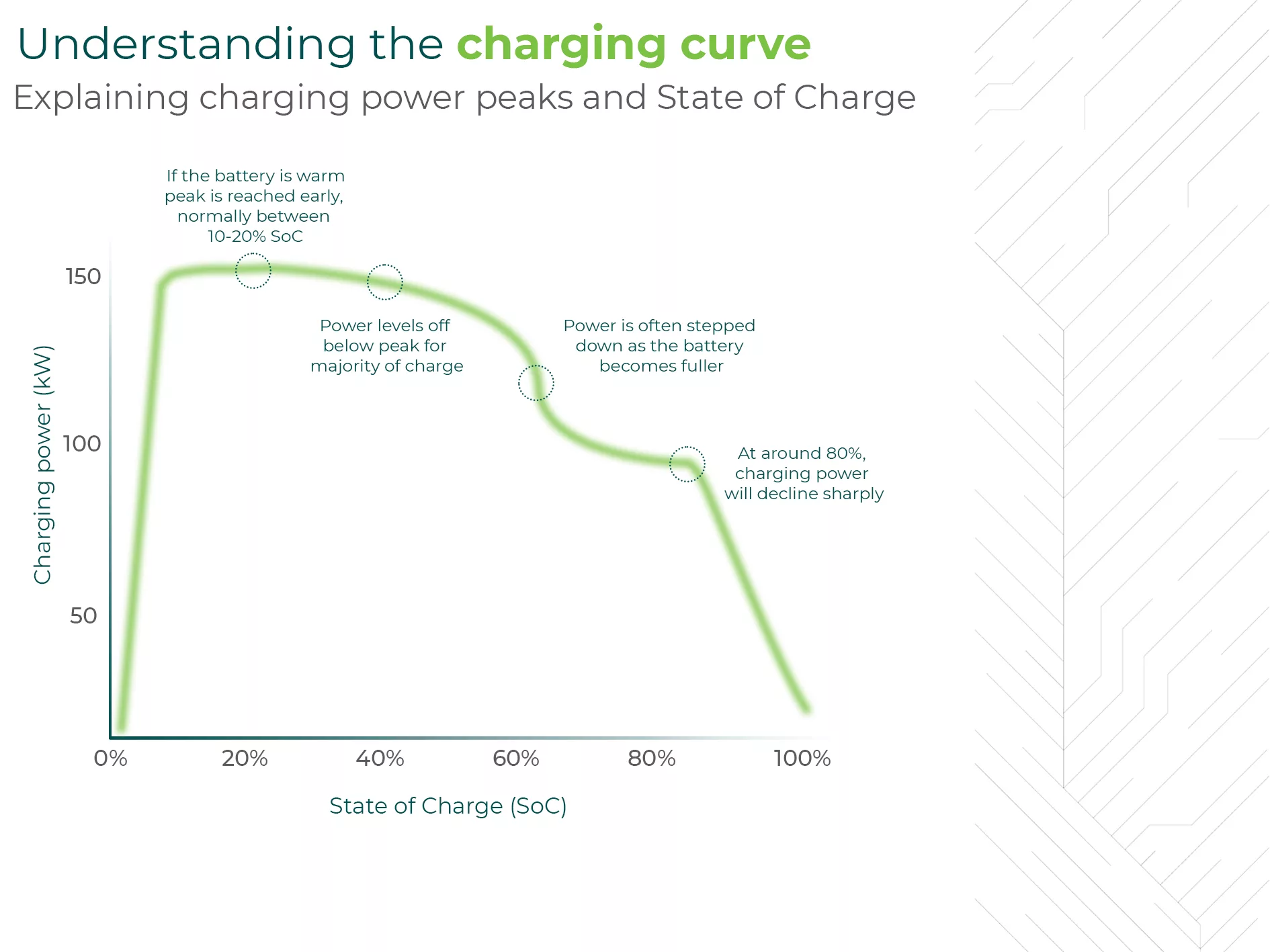 La curva de carga no es más que la representación de cómo varía la velocidad a la que un coche eléctrico absorbe energía durante una recarga. Al contrario de lo que ocurre con el depósito de combustible, en los coches eléctricos no se carga a la misma potencia todo el tiempo. Al inicio de la recarga, especialmente si la batería está por debajo del 20-30%, muchos modelos alcanzan su pico de potencia. Pero este ritmo no se mantiene constante: a medida que el estado de carga (SOC) aumenta, la potencia cae de forma progresiva. Esa es la famosa curva, y es más pronunciada en algunos modelos que en otros.
