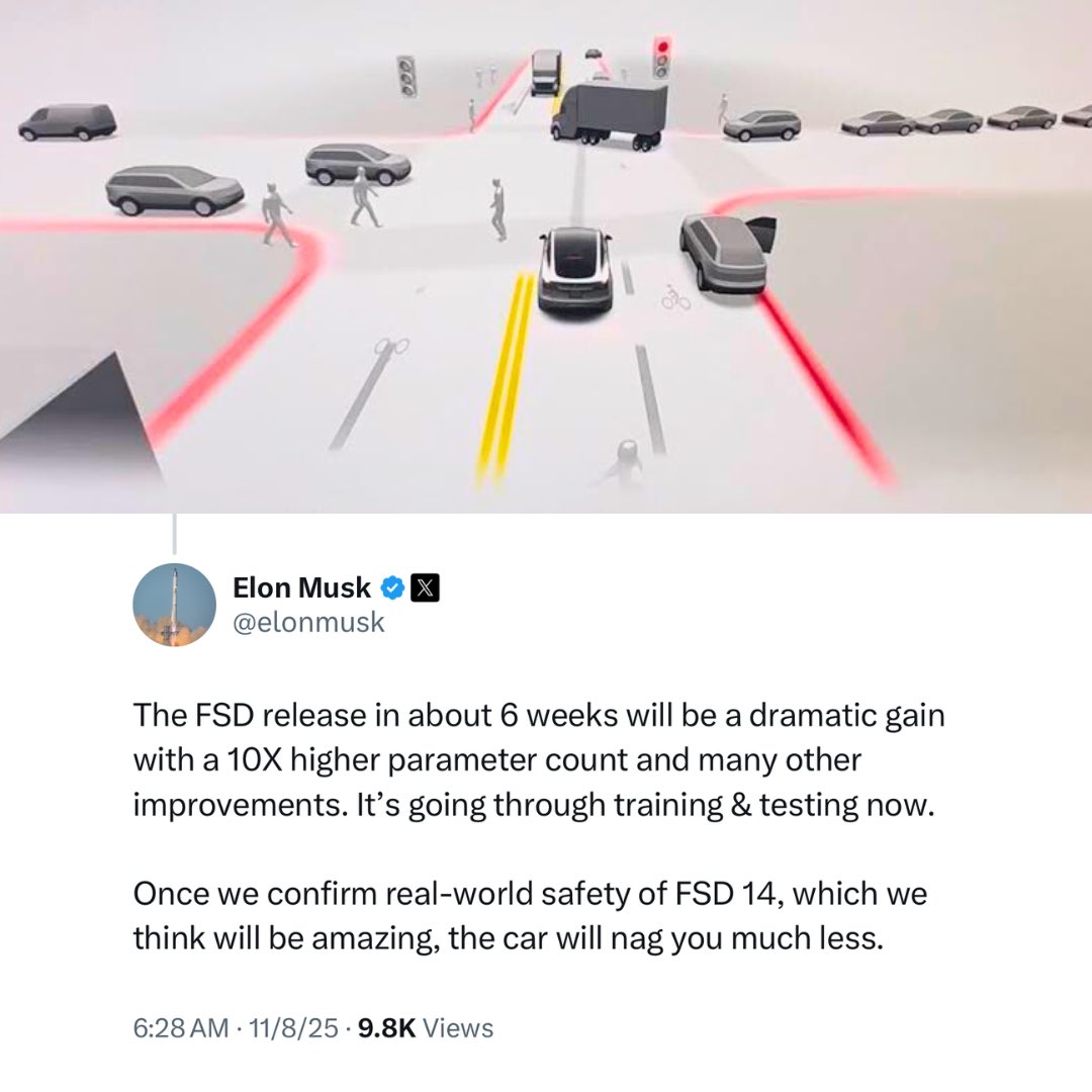 Tesla se prepara para lanzar la versión FSD V14 en un plazo aproximado de seis semanas. Elon Musk ha adelantado que este salto supone multiplicar por diez el número de parámetros del sistema actual, lo que permitirá una interpretación más precisa del entorno y una respuesta más natural ante situaciones complejas.